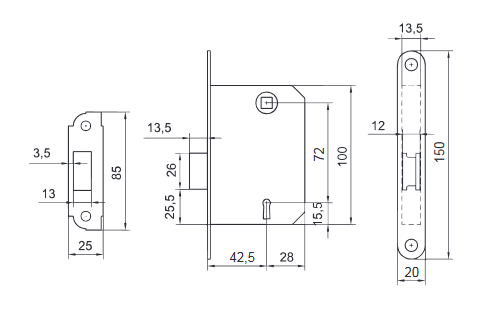 Interax 72 mm. Intrare 42,5 mm. Grosime placă frontală 2 mm.